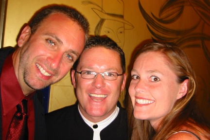 7-8-02 - So then after taking our photo with the captain of the ship, we also took one with the cruise director. He is not a priest, he is just wearing a tux that makes him look like one.